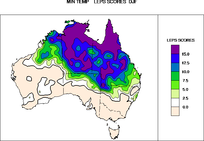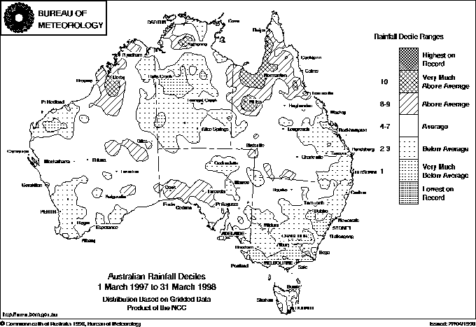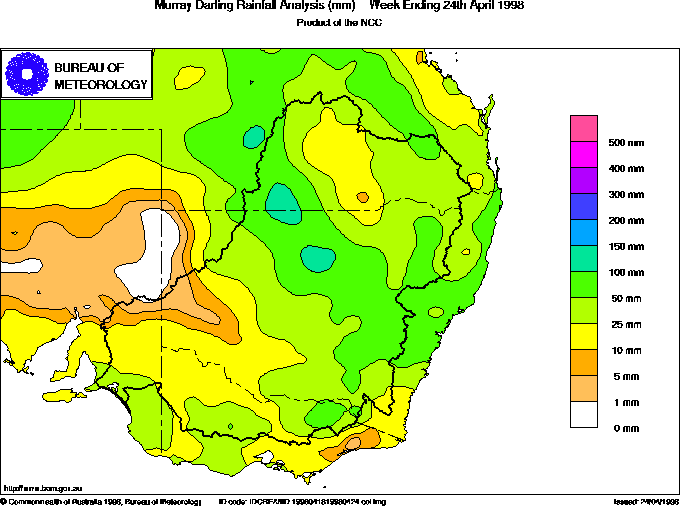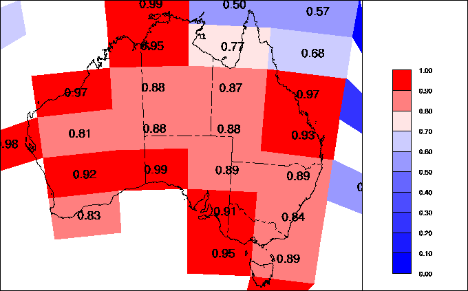 -X this option causes ausmap to produce a raster type plot, where each grid value is plotted as a single colour coded pixel. An example is given below. Warning, grid squares crossing the 0E merdian are not plotted.