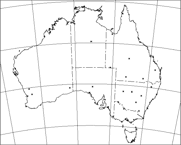 -14.30 126.64 KALUMBURU 1 #-18.23 127.66 HALLS CREEK 6 #-17.95 122.23 BROOME 1 -20.37 118.63 PORT HEDLAND 2 -22.24 118.34 WITTENOOM 1 -24.88 113.67 CARNARVON 3 -26.61 118.54 MEEKATHARRA 1 -30.28 116.66 DALWALLINU 3 -28.80 114.70 GERALDTON 1 -34.37 115.13 CAPE LEEUWIN 1