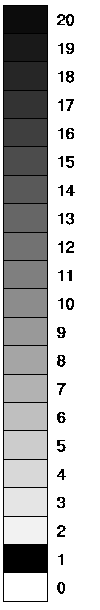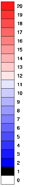 -T allows the user to provide a colour table which is used by ausmap. By default, ausmap has a 22 colour table, with colours 0 and 1 white and black and colours 2 to 20 a rainbow of colours from blue to red (see the -B option). Ausmap prompts the user for the name of the colour table to over-ride the default when this option is used. An example colour file is shown below,